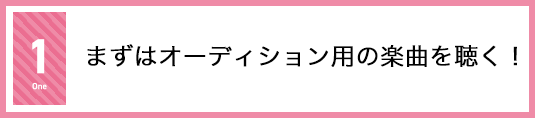 自己PR(30秒程度)と歌唱審査(公開中の課題曲から1曲を選んでいただきます。)を行います。 また当日は、審査の受けかたなどご説明しますのでご安心下さい。