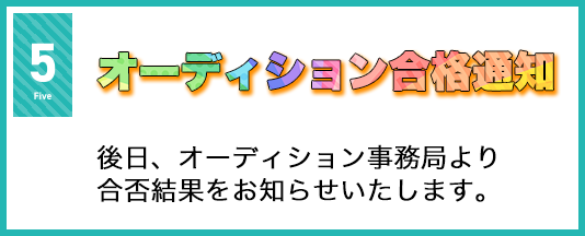 ※オーディション日程のご連絡などメールにてご連絡する事がありますので受信メールにはご注意ください。